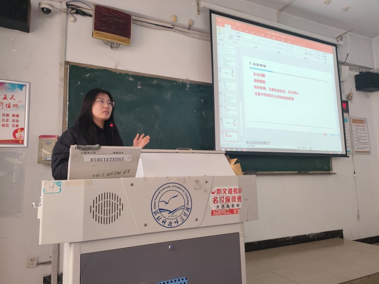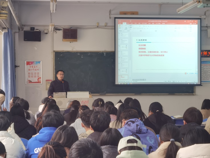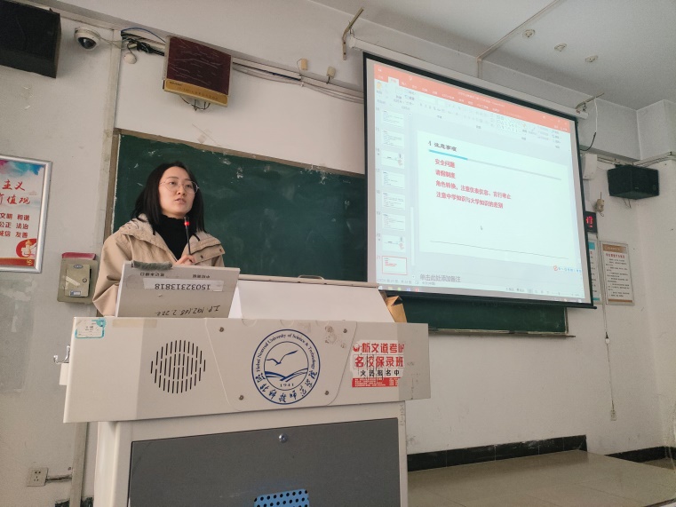 王仕琪老师、韩乾戟老师介绍了教育研习和实习的工作安排,需要提交的文档以及材料书写规则;党雅茹老师对实习学生提出几点要求:一是高度重视实习工作,端正学习态度,积极与指导教师交流,向优秀教师汲取教学经验;二是努力提高教学水平,服从实习学校安排,认真完成工作任务;三是重视人身、财产安全,切实保护自身利益。