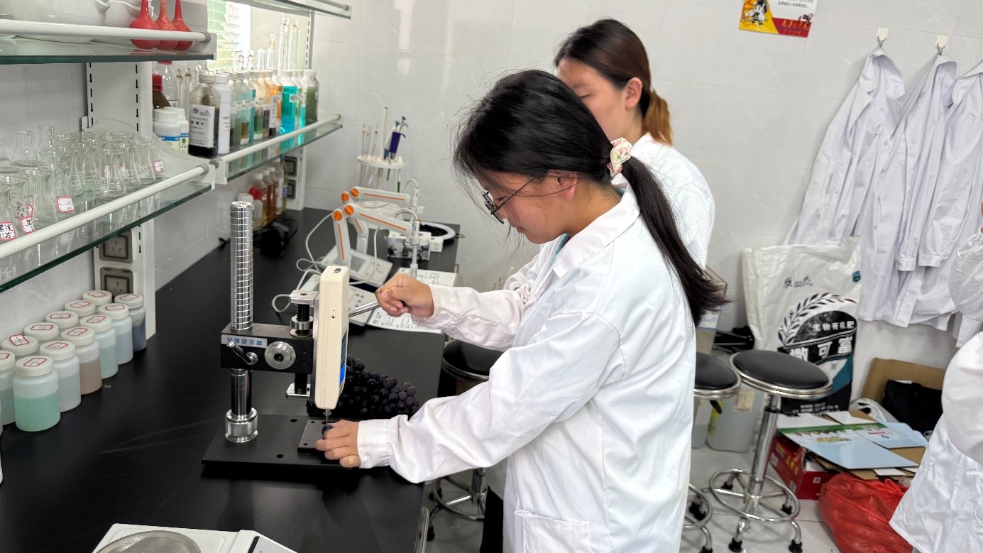 师生一行还前往昌黎县撒可富高品质数字农业推广中心进行实践学习。中心工作人员系统讲解了化肥分类体系,详细阐述了氮肥、磷肥等单质肥料及专用肥在各类作物不同生长阶段的应用策略,并结合实际案例,生动展示了科学施肥对提升作物产量与改善品质的关键成效。在实践环节,学生们在专业指导下,亲手操作测糖仪、果实硬度计等设备,对葡萄样本进行糖度与硬度检测。通过数据对比分析,大家清晰认识到合理施肥与提升农产品品质之间的内在联系,有效实现了课堂知识向实践能力的转化。