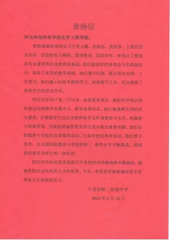 此次教育实习,历时16周,beat365官网学生得到了实习学校的充分认可与肯定,南戴河中学、卢龙县第二高级中学分别给beat365官网发来锦旗和感谢信。