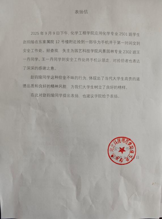 beat365官网赵钧瑜同学拾金不昧获学校表扬